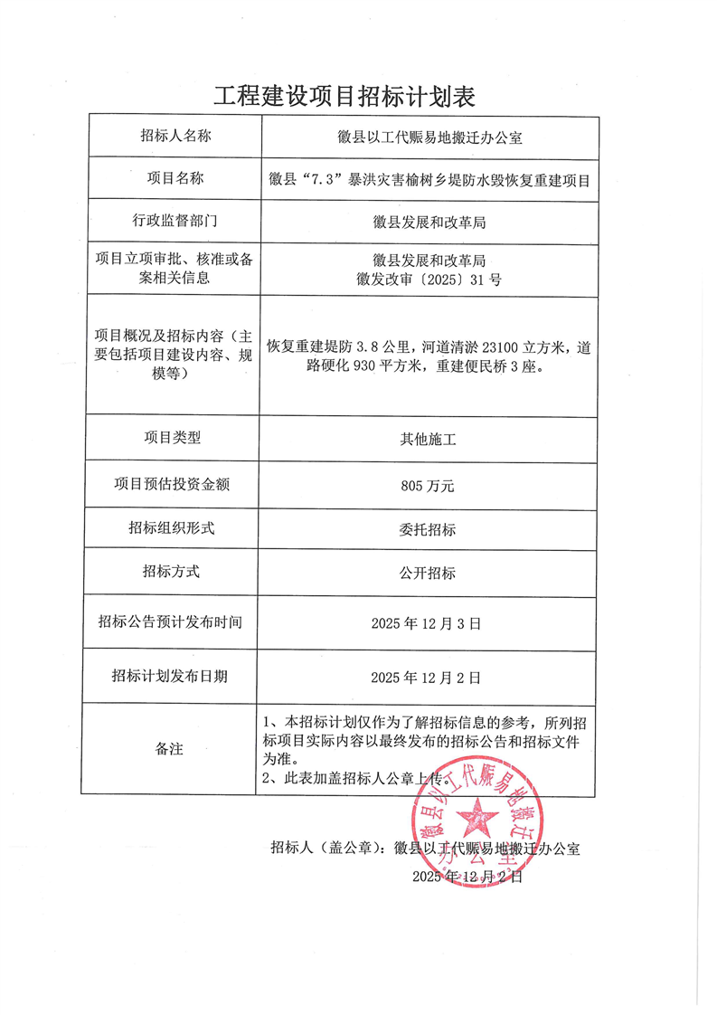 徽縣“7.3”暴洪災(zāi)害榆樹(shù)鄉(xiāng)堤防水毀恢復(fù)重建項(xiàng)目