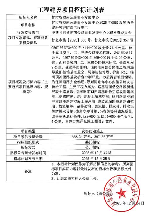 甘肅省隴南公路事業(yè)發(fā)展中心2026年G567線等兩條線路災(zāi)害防治工程施工