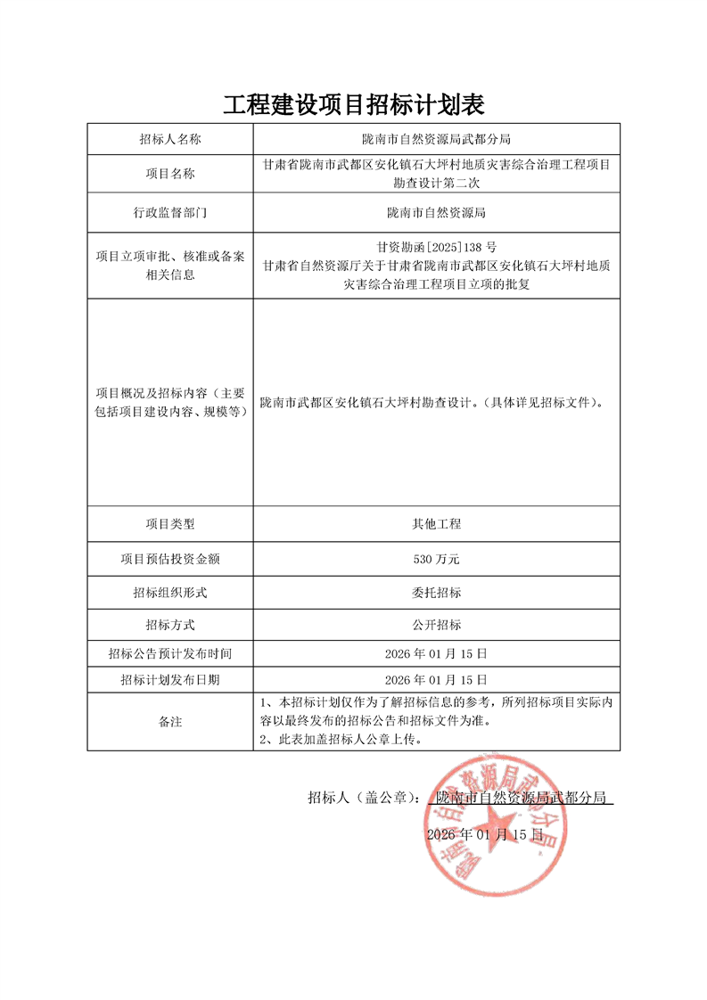 甘肅省隴南市武都區(qū)安化鎮(zhèn)石大坪村地質(zhì)災(zāi)害綜合治理工程項目勘查設(shè)計第二次
