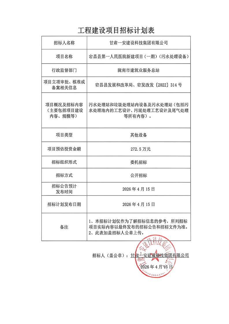 宕昌縣第一人民醫(yī)院新建項目(一期)(污水處理設備)